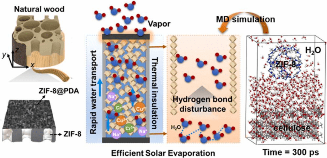 近年來,太陽能界面蒸發技術由于其低成本、無污染、可持續等優點,在應對全球淡水資源匱乏領域展現出巨大的應用前景。如何巧妙設計高效光熱蒸發器是光熱界面蒸發技術的關鍵核心和難點問題。木材是最豐富、可持續、且結構豐富的材料之一,具有天然多孔結構和表面豐富官能團的木基功能材料為開發新型高效太陽能光熱蒸發器開拓了新的思路。