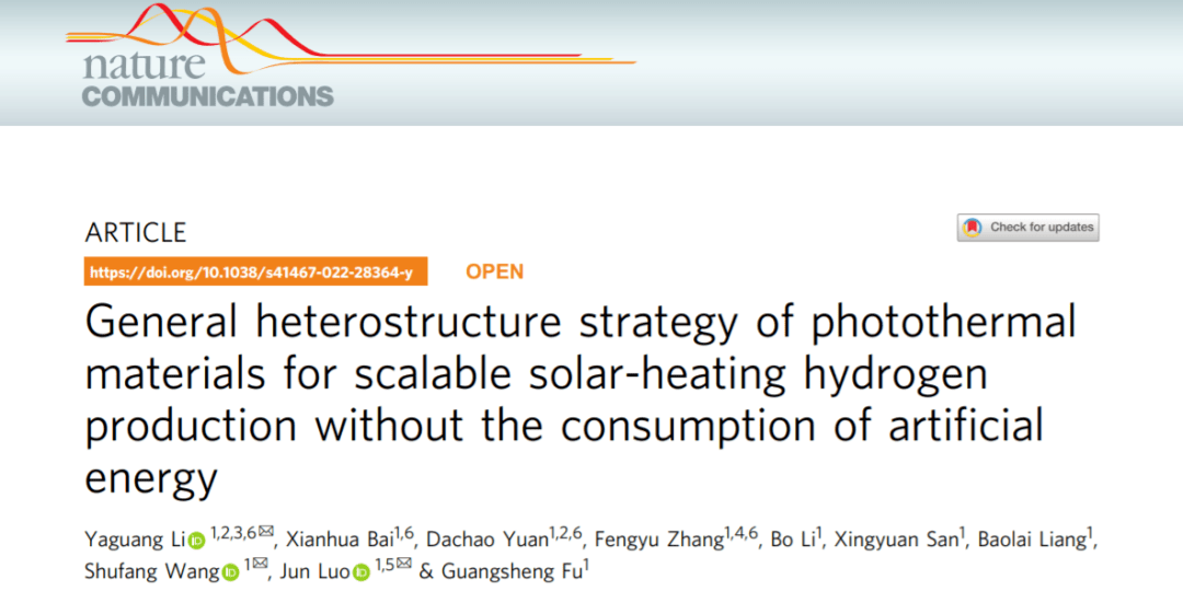 近(jin)日,相關論(lun)文以(yi)《光(guang)熱材料的通用異(yi)質結構策略用于可規模化的太陽能(neng)光(guang)熱制氫》(General heterostructure strategy of photothermal materials for scalable solar-heating hydrogen production without the consumption of artificial energy)為題,發(fa)表在Nature Communications上,李亞(ya)光(guang)擔任第一作者兼通訊作者。