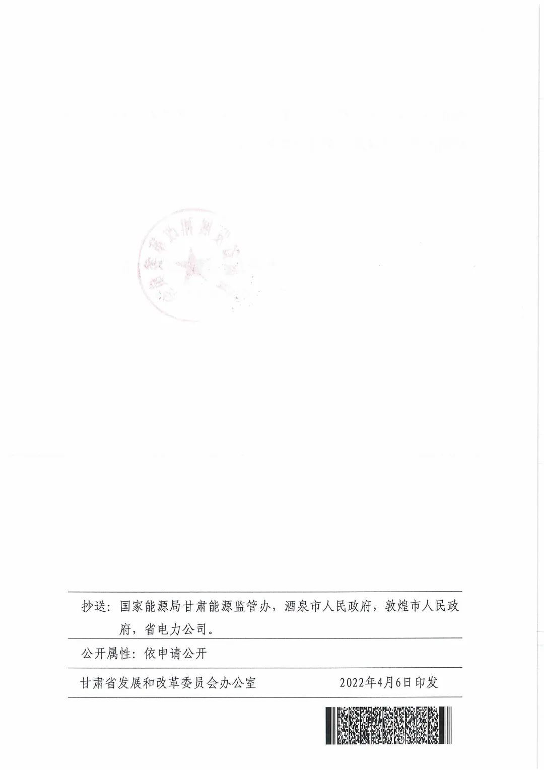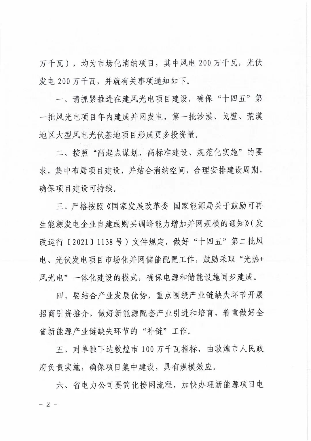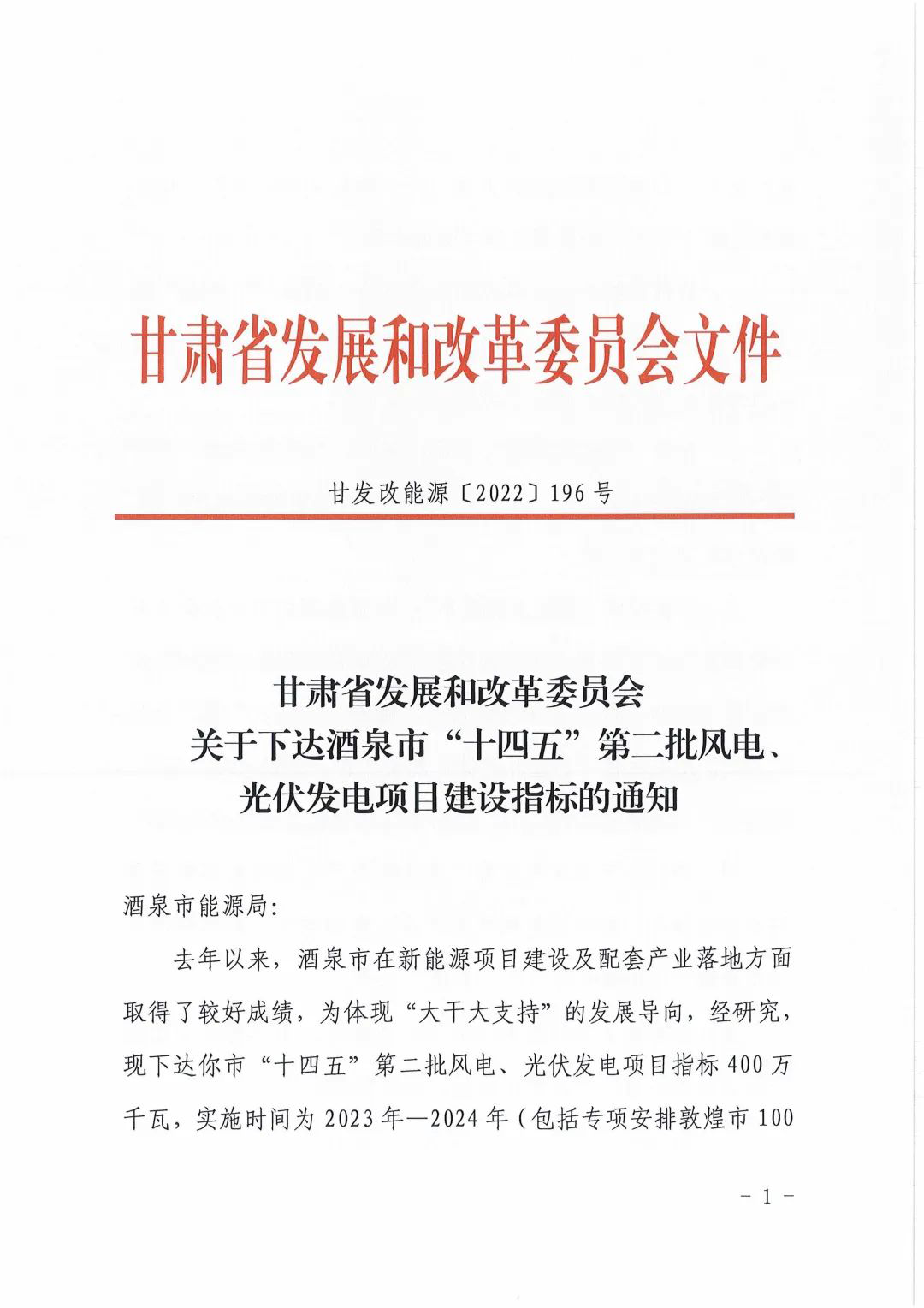 近日,甘肅(su)省發展和改革委(wei)員會下發《關(guan)于(yu)下達酒泉(quan)市“十四(si)(si)五”第(di)二批風電(dian)(dian)(dian)、光(guang)(guang)伏發電(dian)(dian)(dian)項目(mu)建設指標的通知》(甘發改能源(yuan)〔2022)196號)。《通知》提(ti)出(chu)酒泉(quan)市"十四(si)(si)五"第(di)二批風電(dian)(dian)(dian)、光(guang)(guang)伏發電(dian)(dian)(dian)項目(mu)指標為400萬(wan)千(qian)瓦(wa),實施時間為2023-2024年(包括專(zhuan)項安排敦(dun)煌市100萬(wan)千(qian)瓦(wa)),均為市場化消(xiao)納(na)項目(mu),其(qi)中風電(dian)(dian)(dian)200萬(wan)千(qian)瓦(wa),光(guang)(guang)伏發電(dian)(dian)(dian)200萬(wan)千(qian)萬(wan)。