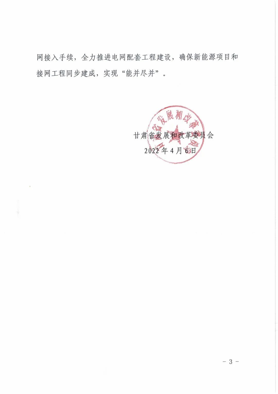 《通(tong)知(zhi)》指(zhi)出(chu),嚴格按照《國(guo)家發(fa)展改(gai)革委 國(guo)家能(neng)源(yuan)局關于鼓勵可再生(sheng)能(neng)源(yuan)發(fa)電(dian)(dian)企業自建或購買調峰(feng)能(neng)力(li)增(zeng)加并(bing)(bing)網(wang)規(gui)模的通(tong)知(zhi)》(發(fa)改(gai)運(yun)行【2021】1138號)文件規(gui)定,做好(hao)“十四五(wu)”第二批風電(dian)(dian)、光伏發(fa)電(dian)(dian)項(xiang)目(mu)(mu)市場化(hua)并(bing)(bing)網(wang)儲(chu)(chu)能(neng)配置工作,鼓勵采取“光熱+風光電(dian)(dian)”一體(ti)化(hua)建設的模式(shi),確保電(dian)(dian)源(yuan)和(he)儲(chu)(chu)能(neng)設施同(tong)步建成。同(tong)時,要求甘肅省電(dian)(dian)力(li)公司要簡化(hua)接網(wang)流程,加快(kuai)辦理新(xin)能(neng)源(yuan)項(xiang)目(mu)(mu)電(dian)(dian)網(wang)接入手續(xu),全力(li)推進電(dian)(dian)網(wang)配套工程建設,確保新(xin)能(neng)源(yuan)項(xiang)目(mu)(mu)和(he)接網(wang)工程同(tong)步建成,實現“能(neng)并(bing)(bing)盡并(bing)(bing)”。