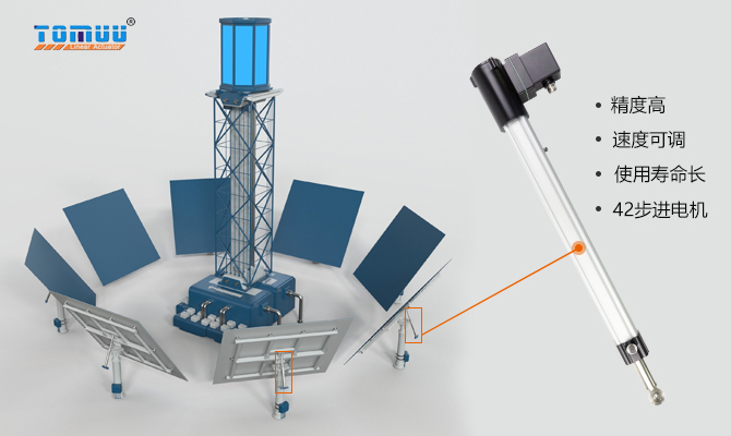 特姆優-U15太(tai)陽能塔式光(guang)熱(re)追(zhui)蹤(zong)電動推桿能適(shi)應(ying)惡劣工作環境(jing),能實現長壽(shou)命和低故障(zhang),已通過(guo)防水/鹽(yan)霧/高(gao)低溫/紫(zi)外線/震(zhen)動/沖擊等檢測,并可在100%負載循環下工作,使用壽(shou)命長,完全免維護,因此廣泛應(ying)用于太(tai)陽能塔式光(guang)熱(re)發電系統。