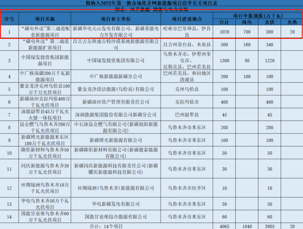 這已經是(shi)今(jin)年新疆下發(fa)的(de)(de)第二批市場化項(xiang)(xiang)目(mu)清單(dan),此前公布的(de)(de)第一批共批復了40.65GW風(feng)光電(dian)站(zhan)項(xiang)(xiang)目(mu),含(han)風(feng)電(dian)10.4GW,光伏30.05GW,光熱200MW【詳(xiang)見下表】。