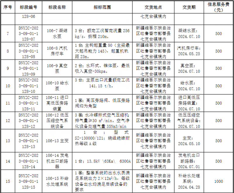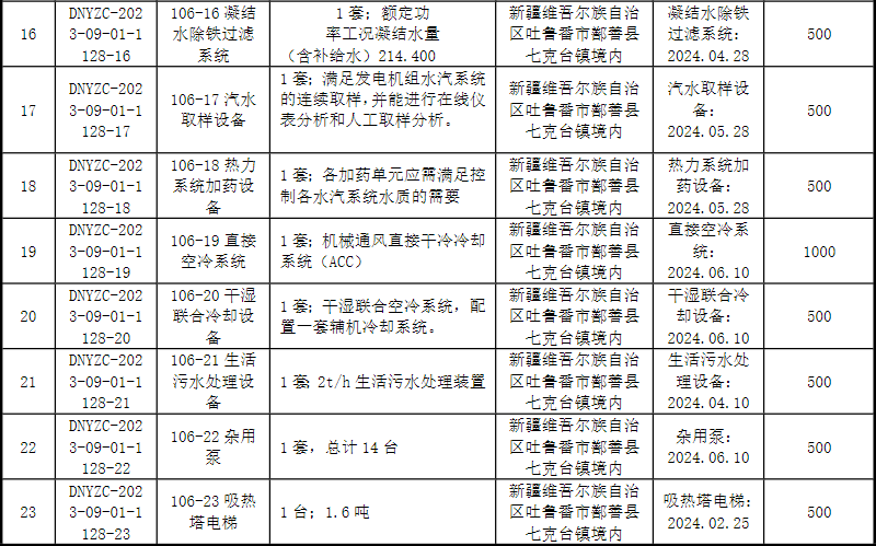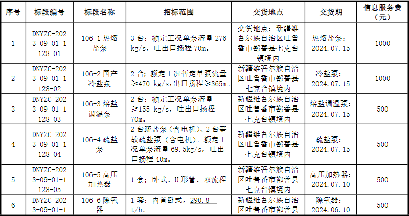國家(jia)電(dian)(dian)投河南公(gong)司新疆吐(tu)魯番鄯善七(qi)克臺100MW光熱(re)發電(dian)(dian)EPC工程(cheng)總承包項目第一批輔機設備工程(cheng)【詳見下表】