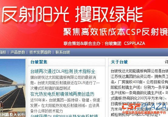 由臺玻悅達太陽能鏡板有限公司與中國太陽能光熱發電行業專業媒體CSPPLAZA合作開設“反射陽光 攫取綠能 聚焦高效低成本CSP反射鏡”專題報道日前正式上線。