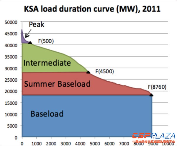 圖表3展示了沙特2011年的負荷和持續時間曲線,其中橫軸表示的為負荷量對應的持續時長(單位:小時),縱軸表示的為負荷量(單位:MW)。