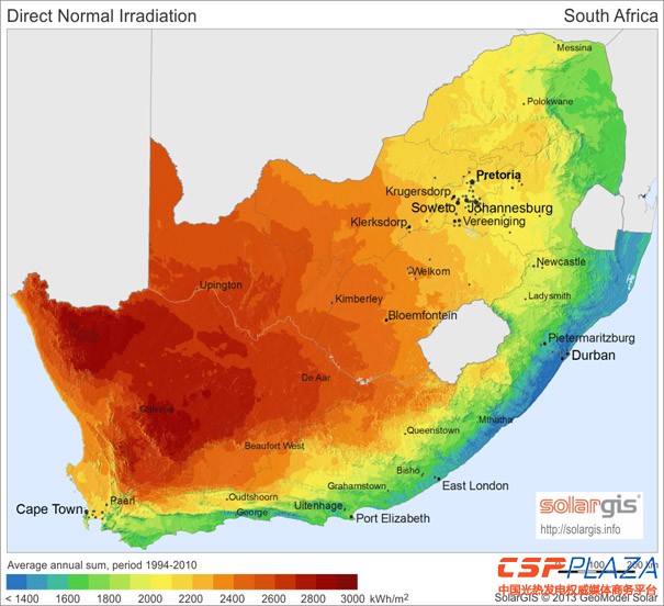 南非當地的太陽能輻照資源位居世界前列,DNI高達2700kWh/m2/y,GHI高達2200kWh/m2/y,太陽能發電開發潛力巨大。不同于中東沙漠地區的多個市場,南非常年天氣晴朗,陽光普照,空氣清潔度高。光熱電站可因此實現較高的容量因子,彌補了因當地夏季高溫天氣而對空冷系統造成的效率削減。