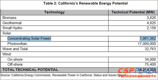 從表中可(ke)見,其中加州(zhou)光熱發電技(ji)術(shu)(shu)的技(ji)術(shu)(shu)潛力裝機可(ke)達(da)1061362MW,未來發展空間很大。加州(zhou)總的可(ke)再生(sheng)能源的技(ji)術(shu)(shu)潛力達(da)18214328MW。