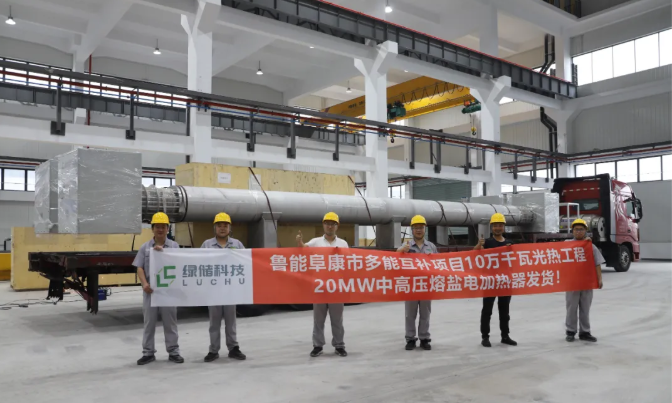 近日,浙江綠儲科技有限公司自主研發的6kV/20MW高壓高溫熔鹽電加熱器發貨,該設備作為風光大基地光熱儲能系統的核心裝備應用于魯能阜康市多能互補(暨新能源市場化并網)項目10萬千瓦光熱工程。
