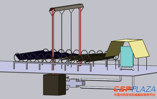 第二種方案以供電為主,采用類似于菲涅爾太陽能熱發電技術的集熱系統,利用菲涅爾系列反射鏡加熱集熱管中的流體產生氣體,再與儲熱體進行換熱以儲熱,在夜間放熱并驅動斯特林發動機發電。