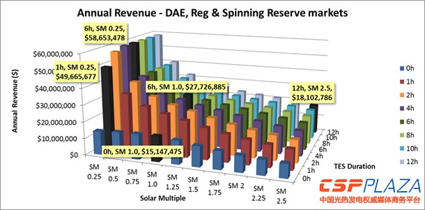 將汽輪機的容量設置的比太陽島的集熱容量更大,是由于加州夜間短時間用電高峰期的高電力價格決定的。儲熱型光熱電站作為電力市場的輔助電源,提供電網調頻和旋轉備用等功能,效益更加明顯。2~4小時的儲熱時長設計一般來說就可以滿足這種需求。多余的汽輪機容量也可以帶來更多收益:如果汽輪機的熱功率比太陽島的集熱輸出功率大4倍,也就是在太陽倍數(solar multiple)為0.25的情況下,即便配1小時的儲熱,光熱電站的收益依然可以增加4倍。但該電站的功能應是作為調頻電源,參與日前市場交易,作為旋轉備用容量。