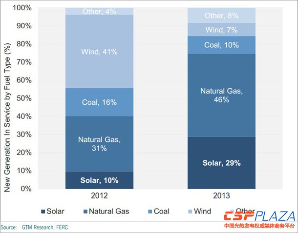 ●2013年太陽能發電占新增電力裝機的29%,比2012年的10%提升了19個百分點;使其成為僅次于天然氣的第二大新增裝機電力;