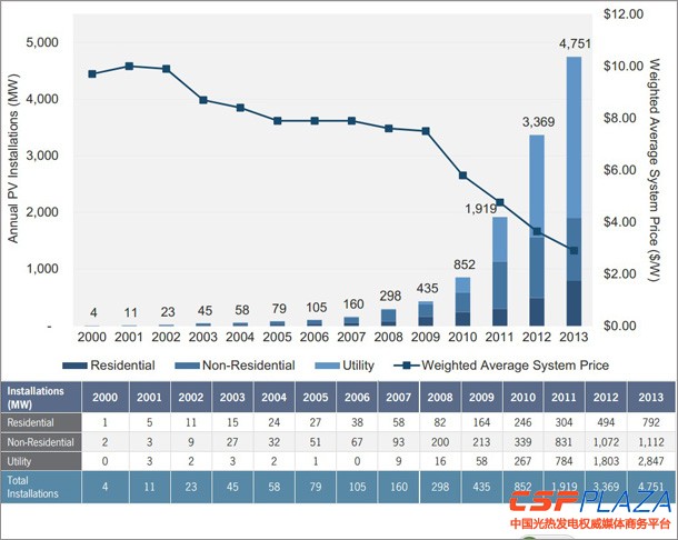 圖:美國光伏裝機(ji)和平(ping)均系統成本(ben)(2000~2013)