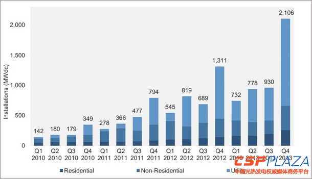 ●2013年第四季度是美國光伏安裝量最大的一個季度,實現2106MW光伏并網,比2012年新增裝機最大的第四階段增長超60%;