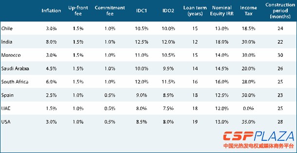 如上所示,融資條件因不同市場而有所不同,具體取決于市場特點和項目特征。為說明這種變化,上表的一些數據展示了在八個不同的光熱發電市場開發光熱發電項目的不同融資參數。每個市場都有特定的融資環境,這也導致了不同市場不同的融資條件和融資成本。