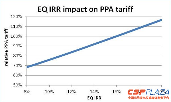 負債比率對降低電價也有重要作用,以上述的南非案例電站為例,貸款利率保持11.5%不變,負債比率從70%上升到80%,可以帶來2.2%的電價削減。但是,負債比率的影響取決于預期股權內部收益率,EQIRR一般要高于貸款利率,負債比率越高則可實現的PPA電價越低。