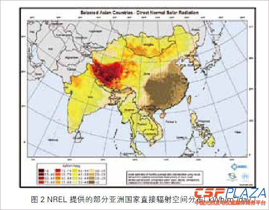 圖1是國家氣象局風能太陽能資源評估中心最新的總輻射年總量空間分布模擬結果。圖2為NREL的直接輻射分布圖。國家局風能太陽能資源評估中心和NREL的資源分布結果顯示,兩者輻射資源分布大體趨勢十分相似,高值區位于青藏高原、甘肅北部、寧夏北部、新疆南部等地。低值區主要位于四川、貴州等地。