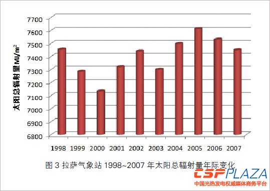 根據拉薩氣象站的輻射資料顯示(圖3),拉薩氣象站的1998~2007年十年的年平均太陽總輻射量為7403MJ/m2。