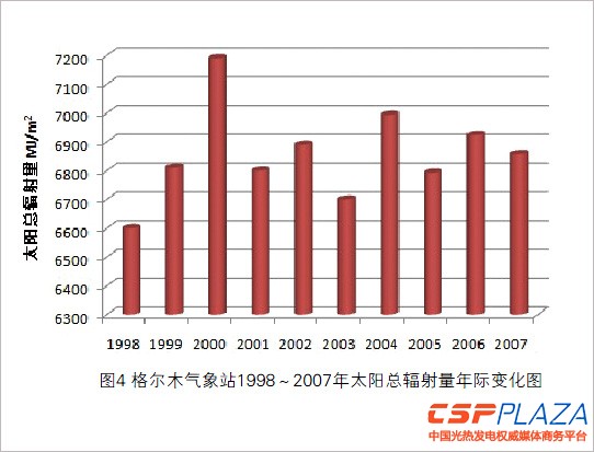 圖5是德令哈氣象站1998~2007年的太陽總輻射量年際變化,年平均太陽能總輻射量為6640MJ/m2。圖6是共和氣象站1998~2007年的太陽總輻射量年際變化,年平均太陽能總輻射量為6589MJ/m2。