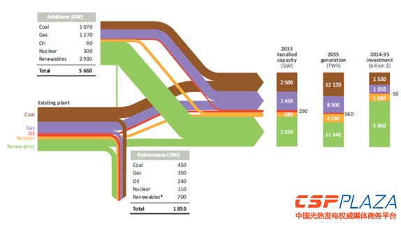 2035年前,全球能源將新增5660 GW,其中,1850 GW用來替換廢棄電廠,剩下的滿足電力增長需求。大部分電廠為天然氣、風電與煤電廠。可再生能源發電容量將新增2930 GW,64%是風能和太陽能。