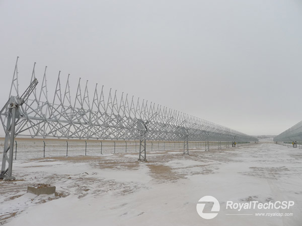 沈衛明:我們項目的選址在內蒙古巴彥悼爾市烏拉特中旗,當地屬多風地區,春季多沙塵天氣,冬季最低溫度接近零下40度。在建設過程中我們遇到了各種自然狀況如沙塵暴、短時強風、洪水等,雖然都有驚無險,但也使我們的項目比預期延后了幾個月才投入運行。通過這次在內蒙地區實施的集熱場示范工程建設,我們對于集熱場工程的項目規劃、集熱場設計、建設施工、物流組織等都有了充分的實戰經驗;現場單元組裝、現場陣列集成安裝等操作流程與規范得到了優化與完善;集熱管與聚光器等核心裝備得到與商業電站運行條件一致的工程測試與效能數據。