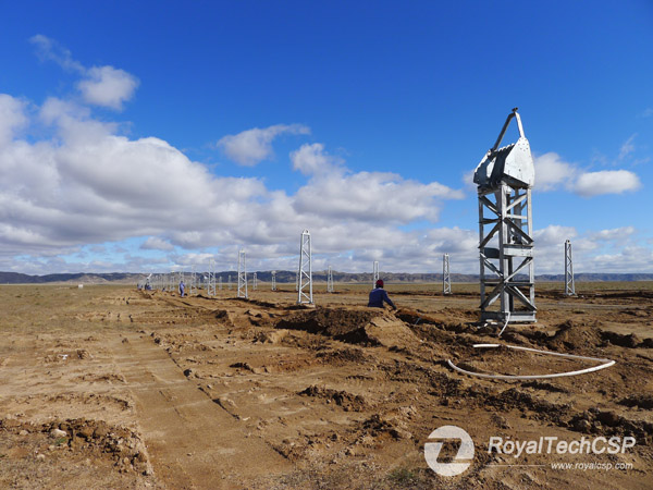 沈衛明:我們項目的選址在內蒙古巴彥悼爾市烏拉特中旗,當地屬多風地區,春季多沙塵天氣,冬季最低溫度接近零下40度。在建設過程中我們遇到了各種自然狀況如沙塵暴、短時強風、洪水等,雖然都有驚無險,但也使我們的項目比預期延后了幾個月才投入運行。通過這次在內蒙地區實施的集熱場示范工程建設,我們對于集熱場工程的項目規劃、集熱場設計、建設施工、物流組織等都有了充分的實戰經驗;現場單元組裝、現場陣列集成安裝等操作流程與規范得到了優化與完善;集熱管與聚光器等核心裝備得到與商業電站運行條件一致的工程測試與效能數據。