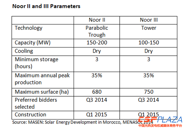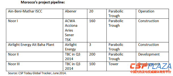 摩洛哥當前已有一個槽式電站在運行,即20MW的Ain-Beni-Mathar ISCC電站,另有一個160MW的Noor1槽式電站在建,將要開發的NoorII和Noor III電站分別為槽式和塔式電站。