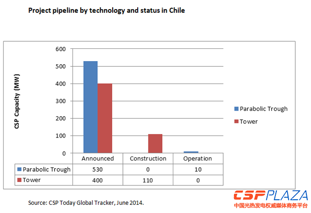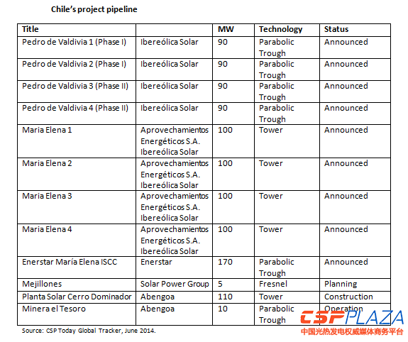 智(zhi)利的光(guang)熱發電(dian)(dian)項(xiang)目開發的一(yi)(yi)個(ge)重要特點是項(xiang)目裝機在(zai)宣布(bu)階段(duan)就(jiu)已經確定,這也是智(zhi)利很多(duo)電(dian)(dian)站(zhan)裝機很大但需(xu)分期(qi)完成(cheng)的原因。如(ru)Maria Elena項(xiang)目是一(yi)(yi)個(ge)400MW的電(dian)(dian)站(zhan),將分4個(ge)階段(duan)完成(cheng),Pedro de Valdivia電(dian)(dian)站(zhan)裝機360MW,也將分四個(ge)階段(duan)建(jian)(jian)設完成(cheng)。光(guang)熱發電(dian)(dian)項(xiang)目向前推進的主要動力來自于(yu)其獲得PPA的能力,除非開發商甘(gan)愿將光(guang)熱電(dian)(dian)能以電(dian)(dian)力市場統一(yi)(yi)價格出售。目前智(zhi)利有一(yi)(yi)個(ge)槽式(shi)電(dian)(dian)站(zhan)在(zai)運行(xing),一(yi)(yi)個(ge)塔式(shi)電(dian)(dian)站(zhan)在(zai)建(jian)(jian)。其它多(duo)數均(jun)處于(yu)早期(qi)階段(duan)。