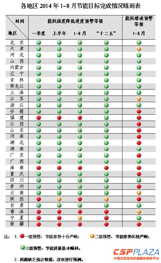 近(jin)日,國家發布了各(ge)(ge)地(di)區2014年1-8月(yue)節(jie)能目標完成情(qing)況晴雨表(biao)。通過(guo)對各(ge)(ge)地(di)區節(jie)能形勢進(jin)(jin)行分析(xi),對照(zhao)各(ge)(ge)地(di)“十(shi)(shi)二五”年均(jun)節(jie)能任(ren)務,1-8月(yue),福建、海南、陜西(xi)、青海、新疆等(deng)5個(ge)地(di)區預(yu)(yu)(yu)警(jing)(jing)(jing)等(deng)級(ji)(ji)(ji)為一級(ji)(ji)(ji),節(jie)能形勢十(shi)(shi)分嚴(yan)峻;寧夏預(yu)(yu)(yu)警(jing)(jing)(jing)等(deng)級(ji)(ji)(ji)為二級(ji)(ji)(ji),節(jie)能形勢比較嚴(yan)峻;北(bei)京、天津、河(he)北(bei)、山西(xi)、內蒙古(gu)、遼寧、吉林、黑龍江(jiang)、上海、江(jiang)蘇、浙(zhe)江(jiang)、安徽、江(jiang)西(xi)、山東、河(he)南、湖北(bei)、湖南、廣(guang)東、廣(guang)西(xi)、重(zhong)慶、四川、貴州(zhou)、云南、甘(gan)肅(su)等(deng)24個(ge)地(di)區預(yu)(yu)(yu)警(jing)(jing)(jing)等(deng)級(ji)(ji)(ji)為三級(ji)(ji)(ji),節(jie)能工作進(jin)(jin)展基本順利。西(xi)藏缺(que)乏(fa)統計數(shu)據,沒有(you)進(jin)(jin)行預(yu)(yu)(yu)測。與上半年相比,陜西(xi)由二級(ji)(ji)(ji)預(yu)(yu)(yu)警(jing)(jing)(jing)上升為一級(ji)(ji)(ji)預(yu)(yu)(yu)警(jing)(jing)(jing),寧夏由一級(ji)(ji)(ji)預(yu)(yu)(yu)警(jing)(jing)(jing)下降為二級(ji)(ji)(ji)預(yu)(yu)(yu)警(jing)(jing)(jing)。