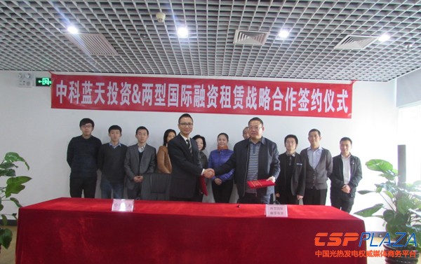 2014年12月22日,深圳中科藍天投資有限公司(簡稱中科藍天)與深圳前海兩型國際融資租賃有限公司(簡稱前海兩型國際)在深圳簽署了戰略合作協議,中科藍天董事總裁陳勝輝和前海兩型國際副董事(shi)長劉(liu)繼(ji)勇(yong)代表雙(shuang)方(fang)在協議上簽字。