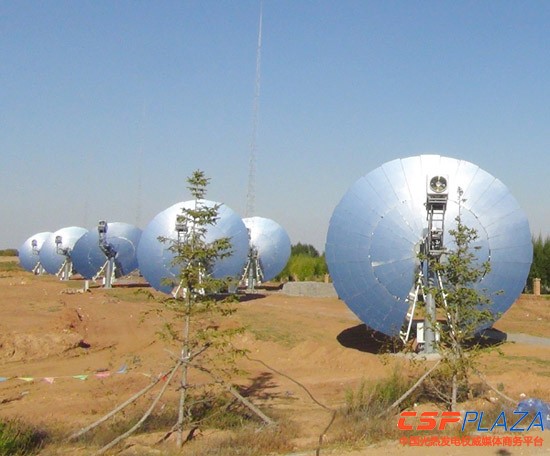 此示范電廠位于鄂爾多斯市烏審旗,占地面積約5000平方米。電廠共由10臺10kW碟式太陽能斯特林光熱發電系統組成,預計年發電量為20萬kWh。