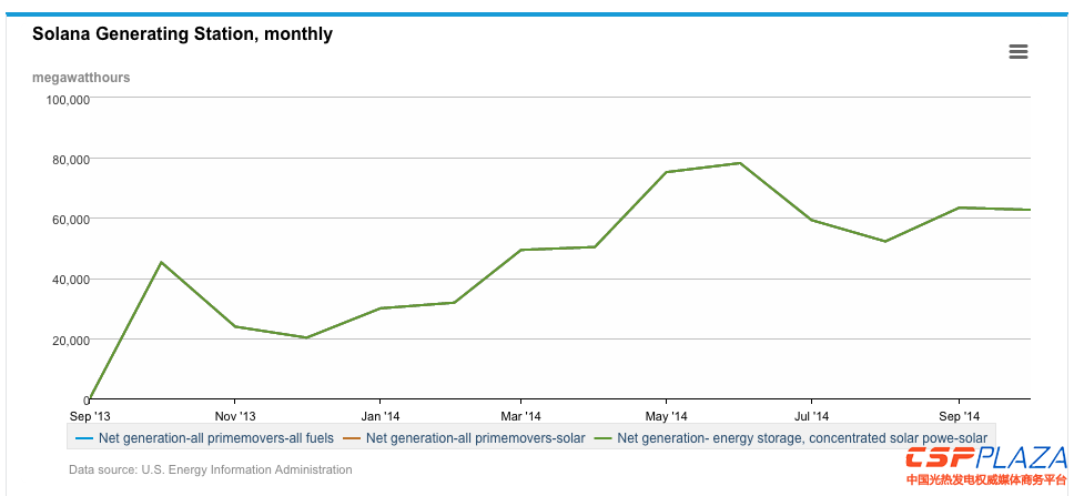 據美國能源信息署EIA數據,該電站在過去的12個月內總發電量為597000MWh,低于設計發電量9.44億度的預期。當然,對于新投運的光熱項目而言,達到設計發電量需要一段過渡期。