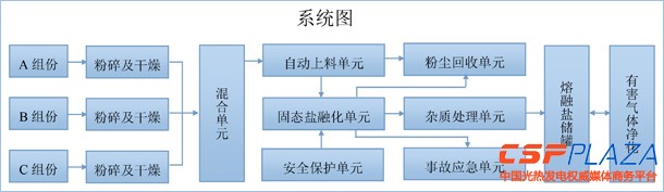 該系統包括以下幾個子系統:1、固態(tai)鹽粉粹和干燥;2、自動上料;3、多(duo)種熔鹽按要求混合;4、粉塵回收(shou)系統;5、固態(tai)熔(rong)鹽(yan)熔(rong)化;6、熔(rong)鹽(yan)升溫和輸送;7、熔鹽雜質處理系(xi)統(tong);8、安全保(bao)護系(xi)統(tong)。系(xi)統(tong)處理流程如下圖: