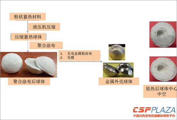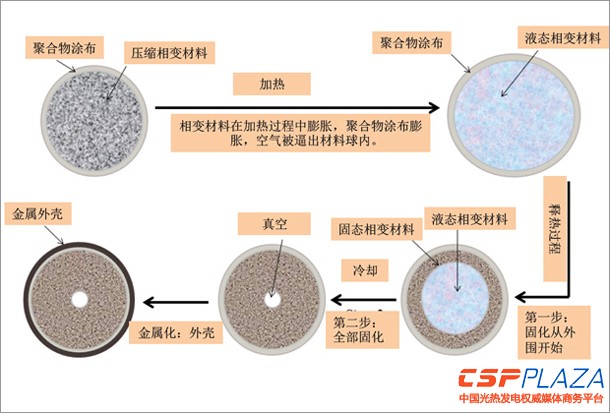 對于該儲熱球的制造和封裝工序,研究人員首先采用液壓機將這種粉狀相變蓄熱材料壓縮,然后用一種低成本、可硬化并具有高滲透率的聚合物涂布將壓縮后的相變材料包裹起來,再通過加熱工序,使相變材料膨脹,聚合物涂布膨脹將空氣逼出材料球內,形成真空。再通過放熱過程,相變材料在球體內由外向內冷卻成為固態,因空氣在加熱過程中被逼出,中心部位形成真空狀態,然后采用電鍍或高溫燒結技術將包裹起來的相變儲熱球封裝一層金屬外殼或者陶瓷外殼。(見圖1)