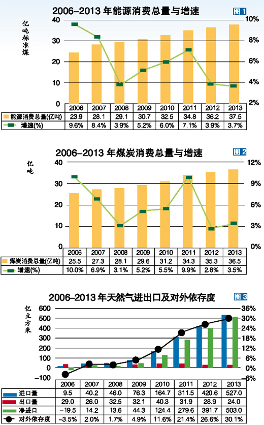 按照2013年我國一次能源消費總量37.5億噸標準煤、煤炭消費總量36.5億噸測算,要實現到2020年的控制目標,2014-2020年年均增幅必須分別控制在3.59%、1.92%以下。但從2006-2013年歷史消費情況分析,控制難度很大。(見圖1、2)