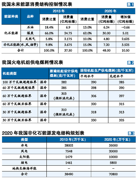 《行動計劃》把“節約優先戰略”列四大能源發展戰略之首;把“節約”作為未來能源發展的第一個戰略方針。而且,設置了能源消費總量“天花板”,即“到2020年,一次能源消費總量控制在48億噸標準煤左右,煤炭消費總量控制在42億噸左右”,“煤炭消費比重控制在62%以內”,成為全文的一大看點。(見表1)