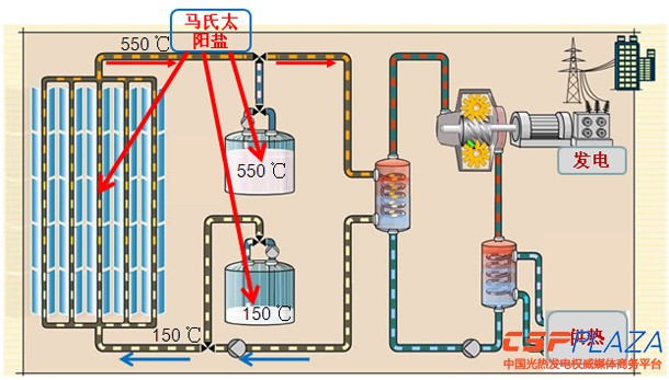 圖:馬氏低熔點太陽鹽傳熱蓄熱槽式電站系統示意圖