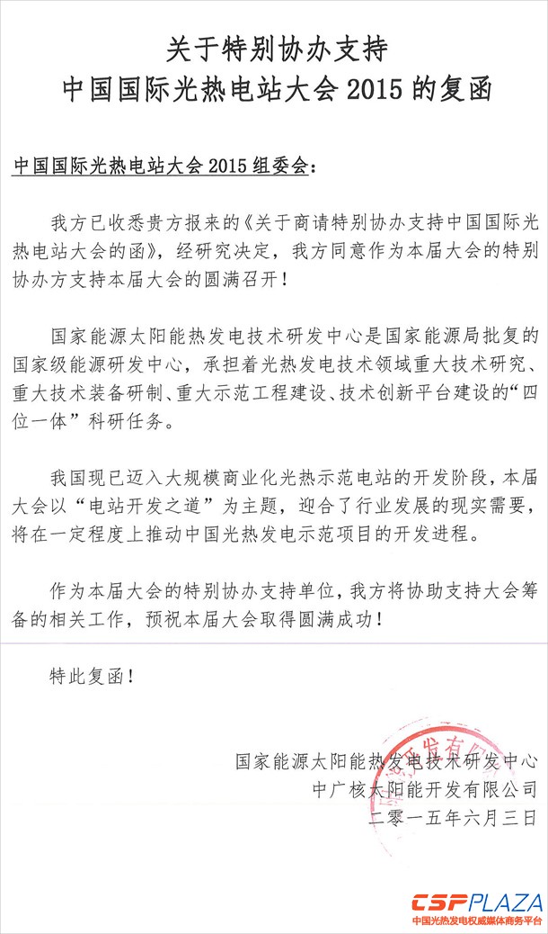 CSPPLAZA光熱發電網訊:中國(guo)國(guo)際光熱電站大(da)(da)會(hui)暨CSPPLAZA年會(hui)(CPC2015)日前(qian)獲得國(guo)家(jia)能源太陽能熱發電技術研(yan)發中心的特(te)別協(xie)辦支(zhi)持(chi)(chi),其在《關于特(te)別協(xie)辦支(zhi)持(chi)(chi)中國(guo)國(guo)際光熱電站大(da)(da)會(hui)2015的復函》中表(biao)示,“作為本(ben)屆大(da)(da)會(hui)的特(te)別協(xie)辦支(zhi)持(chi)(chi)單位,我方將協(xie)助支(zhi)持(chi)(chi)大(da)(da)會(hui)籌備(bei)的相關工作,預祝本(ben)屆大(da)(da)會(hui)取得圓滿(man)成功!”