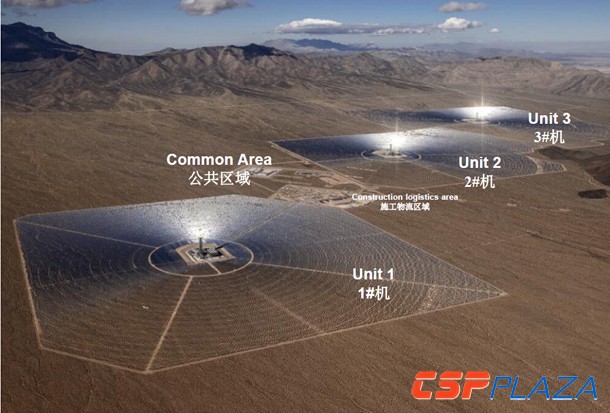 如上圖為鳥瞰圖,項目的場址在拉斯維加斯南部45英里的地區,在一個河床地區。光熱電站的布局,我們討論的話題是太陽能電站的EPC,項目的布局是不規則的。從鳥瞰的角度來看,很明顯是呈不規則的光場布局。布局在設計的時候考慮到了當地的地形,最終決定設計光場的布局。我們可以看到在這個地區也有一個車道,為了能夠幫助施工以及清潔人員到光場中去進行清潔工作。
