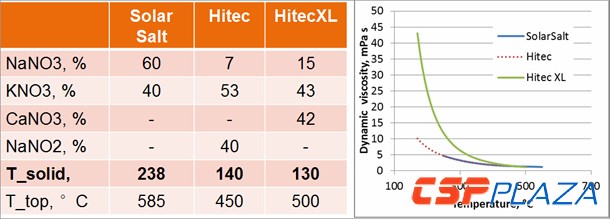 我們再來說一下低熔點鹽,這里存在著很多的可選產品,今天想跟大家列舉兩個,分別是:Hitec和HitecXL,它們都是二元鹽,可以利用這種鹽的結構,可以利用它們很好的組成成份,比較低的熱穩定性,以及低溫下更高的黏度,能夠獲得更低的固化溫度。除此之外上端最高運行溫度也會有所降低,這是其中的一個問題