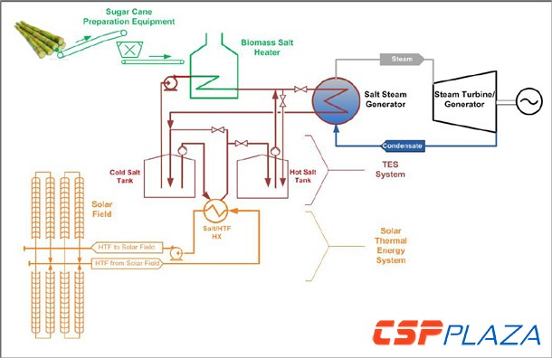 大家可以看上面的圖片,下面是太陽能,上面是生物質輔助燃料來源,天然氣和甘蔗梗兩個能源,把這兩種能源進行混合,利用存儲的熱能,現場儲存還可以進行綜合的利用,向渦輪提供能源,多種配置的方式可以進行優化。