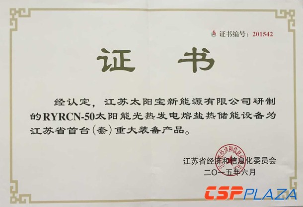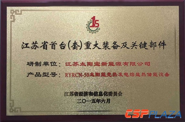 近日(ri),江蘇太陽寶新能源有(you)限公司(簡稱太陽寶)自主(zhu)研(yan)制(zhi)的(de)RYRCN-50太陽能光熱發電(dian)熔(rong)融鹽儲能設備通過江蘇省經濟(ji)和信(xin)息化的(de)認定(ding),正(zheng)式被評為(wei)“江蘇首(shou)臺(套(tao))重大(da)裝備產品”。
