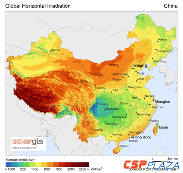 圖片說明:如該太陽輻射地圖所示,中國有豐富的太陽能資源。