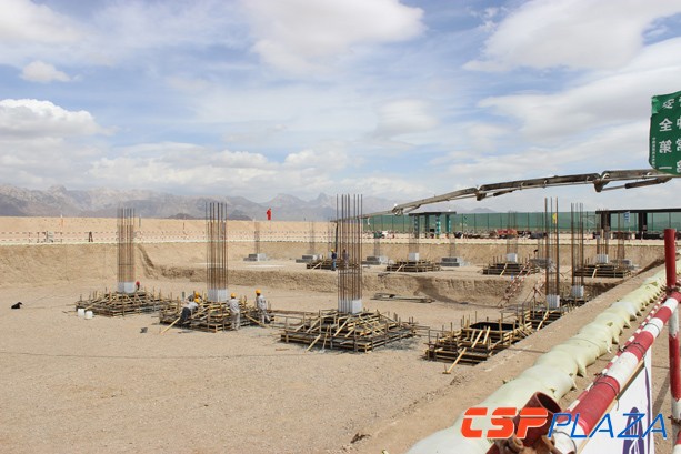 該項目占地(di)面積約2.5km2,地(di)勢(shi)北(bei)高(gao)南低,南北(bei)向(xiang)自(zi)然坡度約為3%~4%,對(dui)比周邊地(di)貌和(he)目前場址情況,可以想(xiang)象場平(ping)工(gong)作量(liang)之大,從現(xian)場情況來看(kan),場平(ping)工(gong)作完成出色。本項目集熱(re)場采用階梯(ti)布置(zhi)方案,從北(bei)到(dao)南共設置(zhi)了六(liu)階平(ping)臺,總計192個標準槽式(shi)集熱(re)回路將分布安裝于這六(liu)階平(ping)臺上。