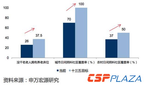 “十三五”規劃確定的目標是:每千名老人擁有養老床位35到40張(目前 26%),城市日間照料社區全覆蓋(目前70%),農村覆蓋率超過50%(目前 37%)。
