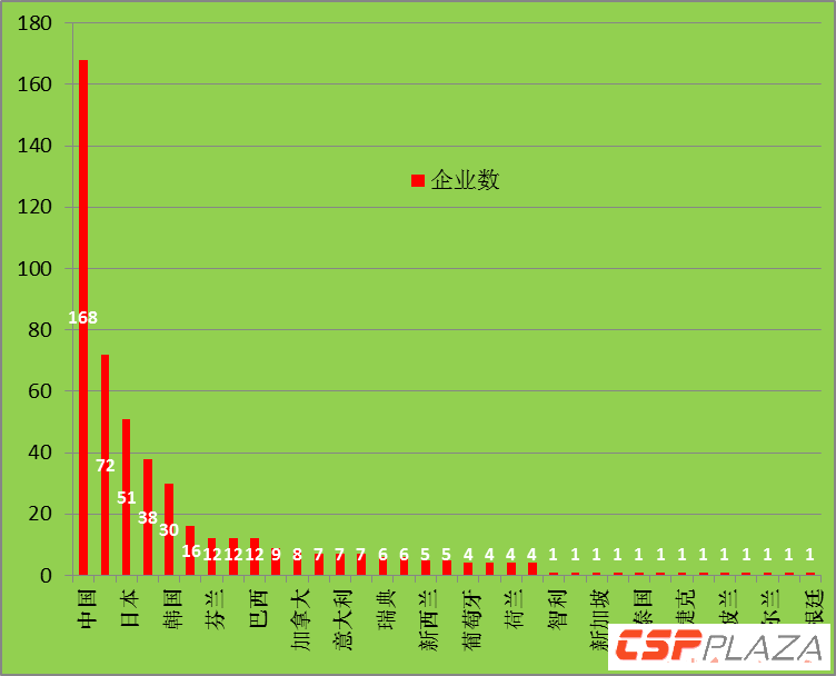 2015年 “500強”上榜企業分別來自37個國家和地區,比2014年 “500強”多1個國家。其中,中國(中國大陸及香港、澳門、臺灣)有協鑫(集團)控股有限公司、晶龍實業集團有限公司、國電科技環保集團股份有限公司、龍源電力集團股份有限公司、天能集團、阿特斯陽光電力科技有限公司、新疆金風科技股份有限公司等168家企業進入“500強”榜單,比去年(163家)增加5家,占33.6%,居首位;美國有GE Energy、Archer Daniels Midland Company、Dow Corning Corporation、Valero Energy Corporation、Bunge Ltd.、POET LLC、First Solar Inc.、Sunpower Corporation、SunEdison Inc.等72家企業進入“500強”榜單,比去年(74家)少2家,占14.4%,位居第二;日本則有Sanyo Electric Co., Ltd.、Sharp Corporation、Toshiba Corporation、Kyocera Corporation、Solar Frontier K.K.等51家企業進入“500強”榜單,比去年(41家)多10家,占10.2%,排名超過德國升至第三;德國有Siemens AG、Enercon GmbH、E.ON Kraftwerke GmbH、Nordex SE、Juwi Holding AG等38家企業進入“500強”榜單,比去年(48)少10家,占7.6%,退居第四;韓國有OCI Company Ltd.、LG Chem., Ltd. 、SK Group等30家企業進入“500強”榜單,與去年(30家)持平,占5.8%,位居第五;西班牙則有16家,占3.2%,位居第六; 芬蘭、法國、巴西各12家,各占2.4%,并列第七;印度9家,占1.8%,位居第十(見圖1)。
