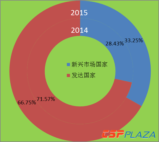 圖5 2014、2015“500強(qiang)”發達國家與新興市場(chang)國家上榜企(qi)業總營收占(zhan)比圖