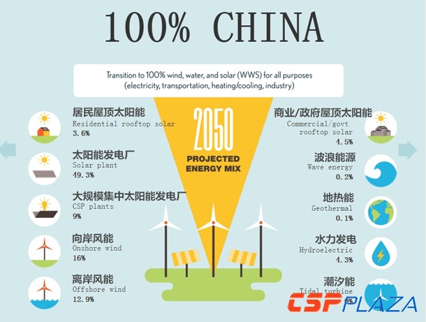 斯坦福大學的研究人員分析了139個國家的能源藍圖,在100%可再生能源的供能情景下,光熱發電的供能比例將占到2050年中國總能源供應的9%。