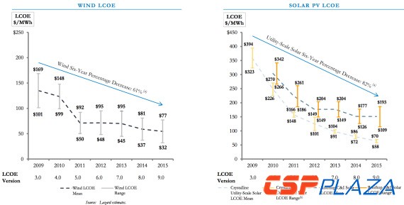 報告中指出,盡管美國的天然氣成本近來已經顯著下降,但是太陽能和風能發電成本在很多時候都已經低于傳統發電資源,這部分是因為2009年以來,太陽能發電成本下降80%,風電成本下降60%。