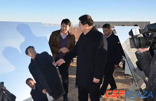 考察、調研期間,王黎明一行饒有興趣地參觀整個鏡場及發電機組等部分。在聽取了劉文闖關于50MW太陽能熱發電項目(一期)整體建設情況、各項技術成果以及項目進展情況的匯報后,王黎明充分肯定該項目的技術成果,對中控取得的成績表示祝賀;同時指出,中控一定要加快50MW塔式太陽能熱發電項目的建設步伐,加大新技術、高科技的引進力度,以科技創新推動青海省清潔能源產業的良好快速發展。