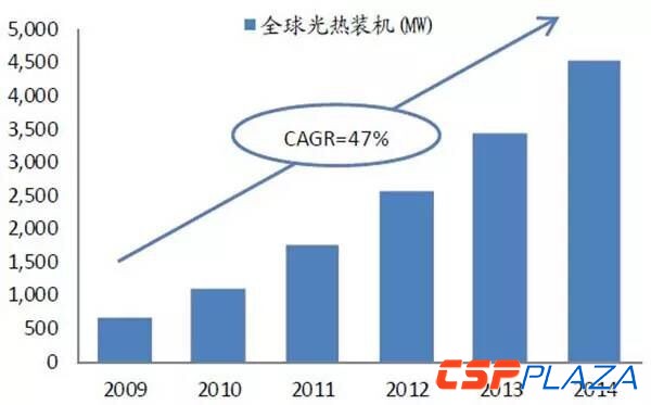 全球光熱裝機量在各國補貼優惠政策的支持下呈現高速增長,過去5年內全球光熱裝機量復合增速達到47%,據統計至2014年底全球光熱裝機總量約為4.5GW。